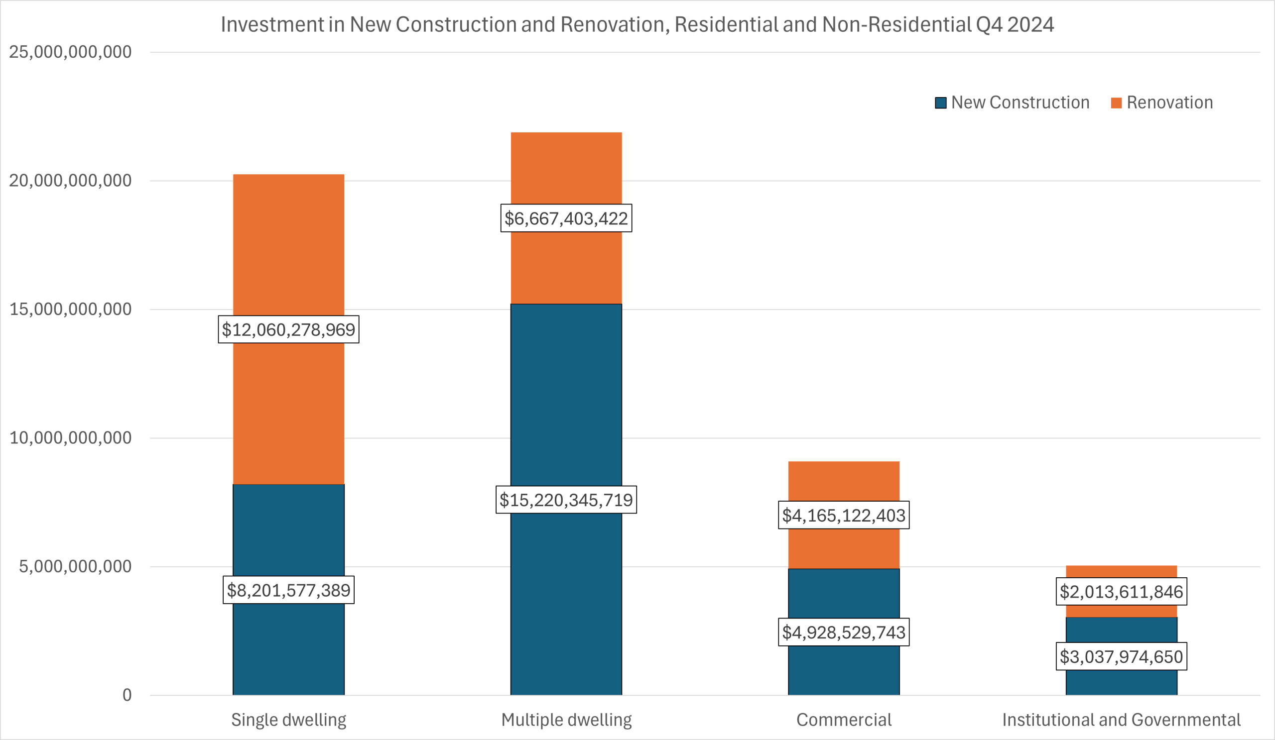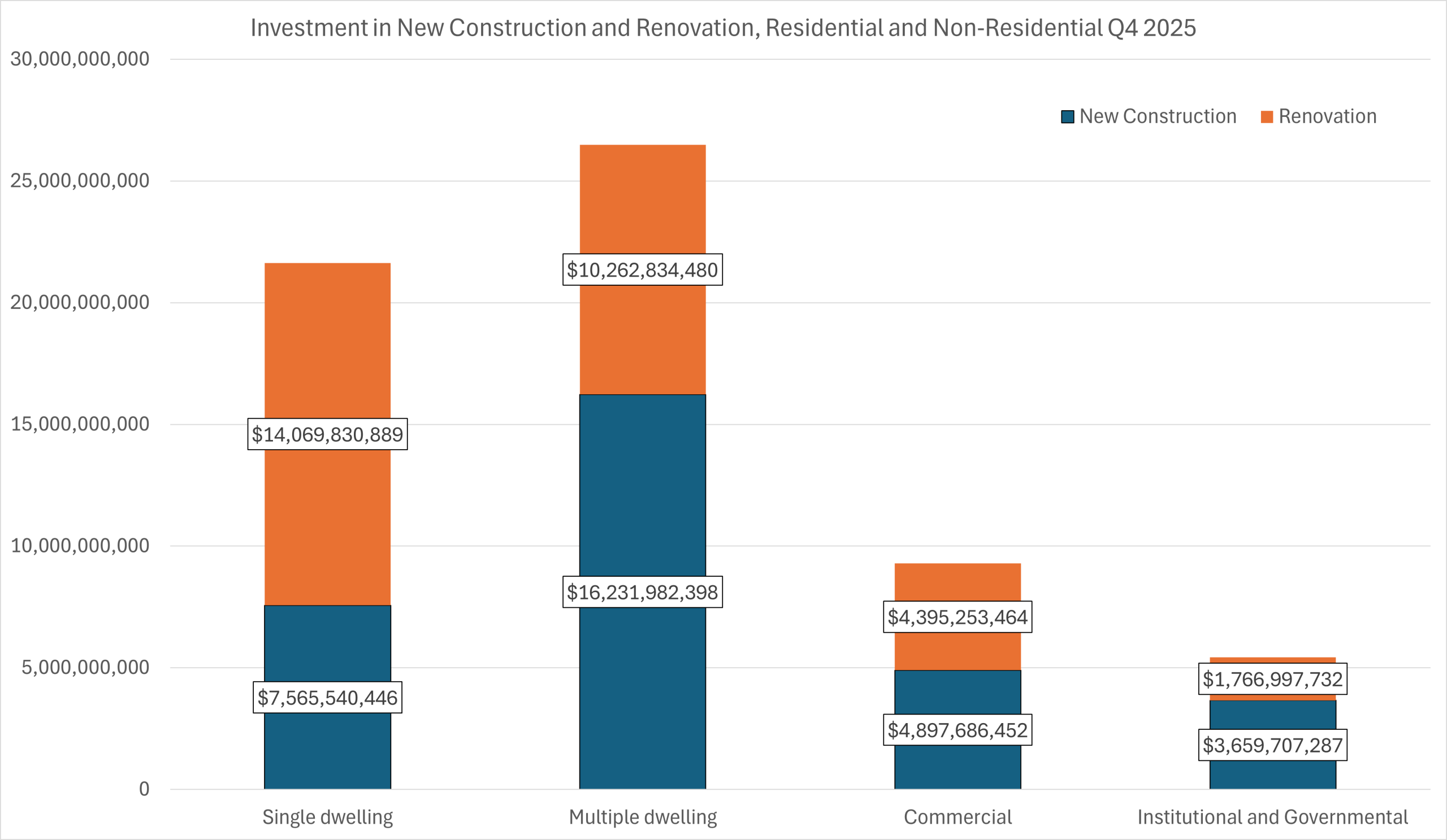 In contrast, the multi-dwelling segment continues to expand. New construction increased from $15.2 billion to $16.2 billion, indicating sustained demand for higher-density housing formats. Renovation activity in this segment also grew sharply, from $6.7 billion to $10.3 billion. This acceleration points to both reinvestment in existing multi-unit stock and adaptation of properties to meet evolving rental and urban housing demand. Taken together, residential growth is being driven less by low-density expansion and more by intensification and upgrading.
