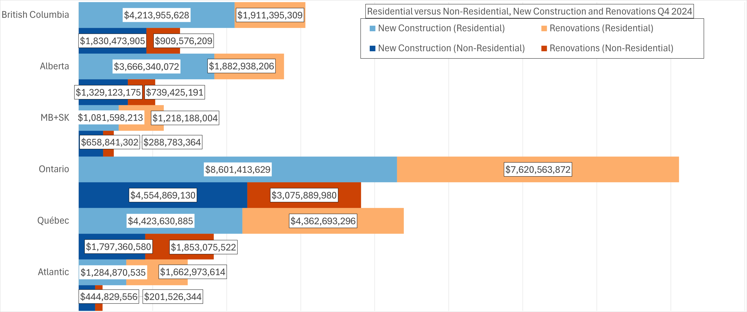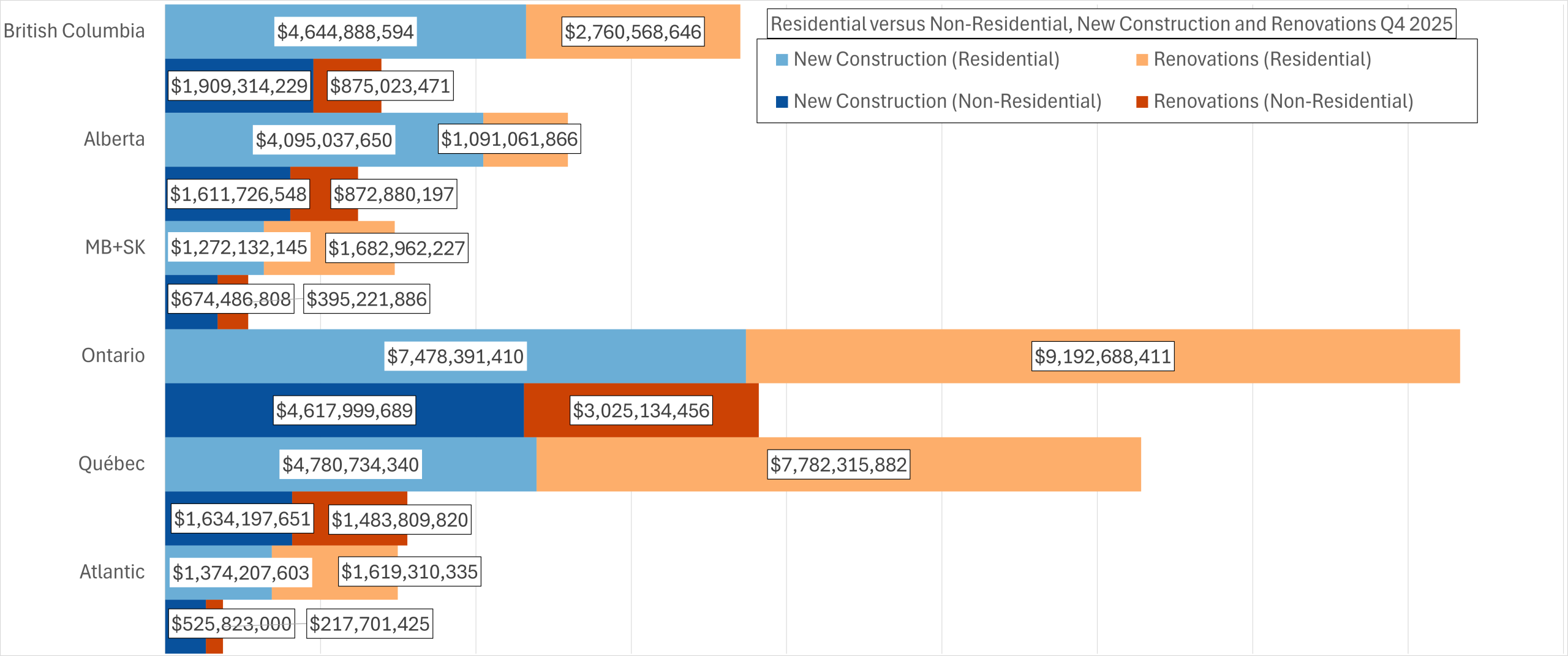 Alberta’s data reflects divergence between residential and non-residential dynamics. Residential new construction increased from $3.67 billion to $4.10 billion, but renovation dropped sharply from $1.88 billion to $1.09 billion. This suggests a stronger emphasis on new supply rather than reinvestment. In contrast, non-residential activity grew across both new construction and renovation, indicating broader economic support for commercial and institutional projects.